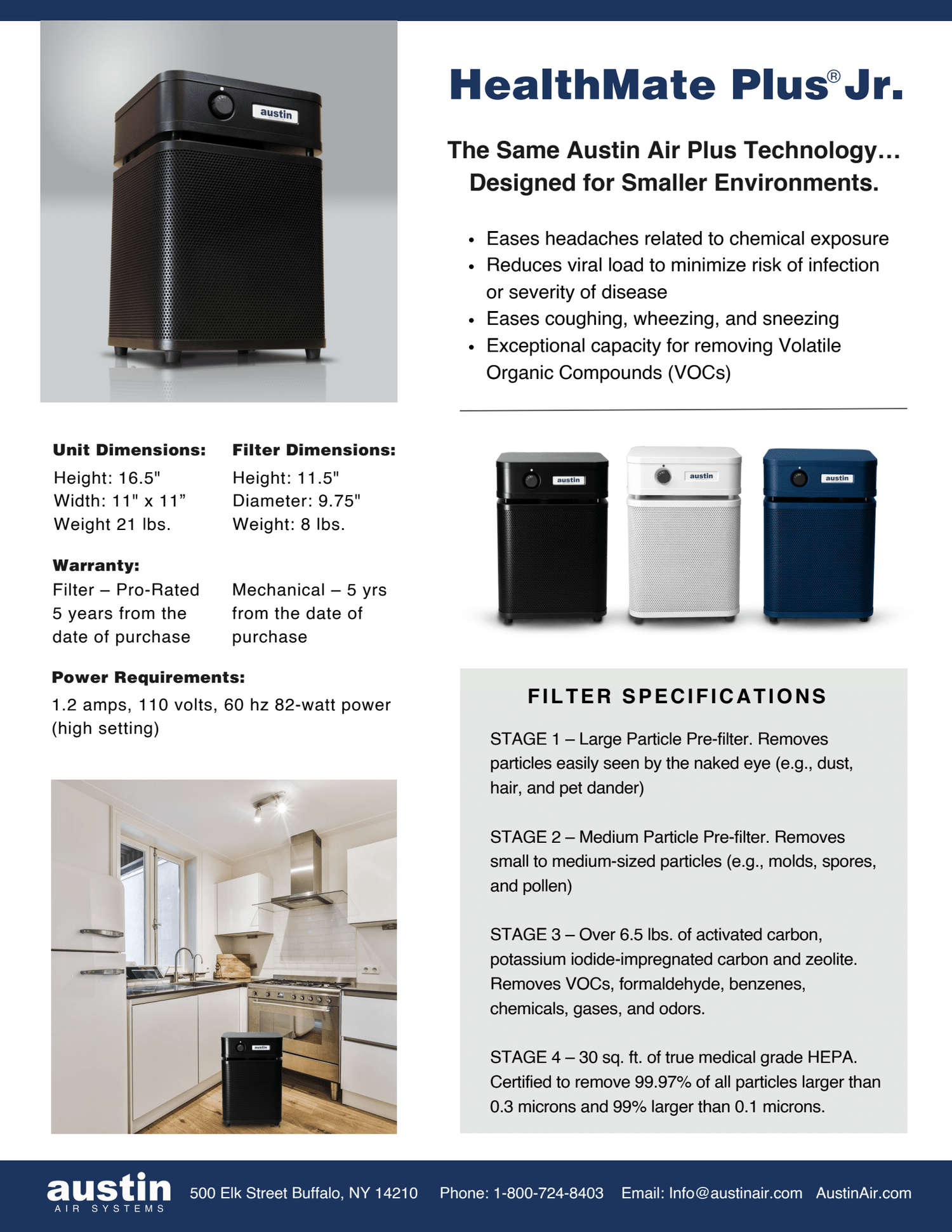 The Austin Air HealthMate Plus Junior offers the same advanced, broad-spectrum air cleaning performance as the full-size HealthMate Plus, optimized for smaller spaces. Its 4-stage filtration system combines Medical-Grade HEPA with a potassium iodide–enhanced carbon and zeolite blend, effectively capturing up to 99% of airborne viruses and bacteria as small as 0.1 microns, while neutralizing chemicals, VOCs, formaldehyde, smoke, gases, and household odors.