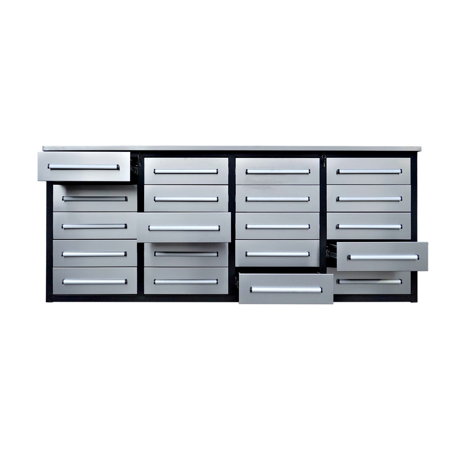 This heavy‑duty workbench features 20 full‑extension drawers equipped with smooth ball‑bearing slides and ergonomic full‑width handles, allowing effortless access and efficient organization of tools of various sizes. Each drawer includes anti‑slip liners that help keep tools and supplies secure and in place during use. A secure locking system adds a level of protection for valuable tools when the workbench is not actively in use.