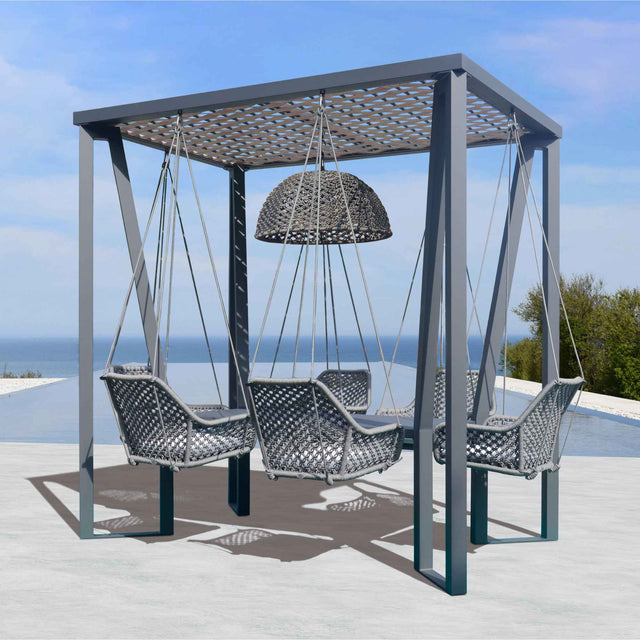 Includes 6 Moma Hanging Chairs, aluminum dining table, pergola frame, and overhead lamp