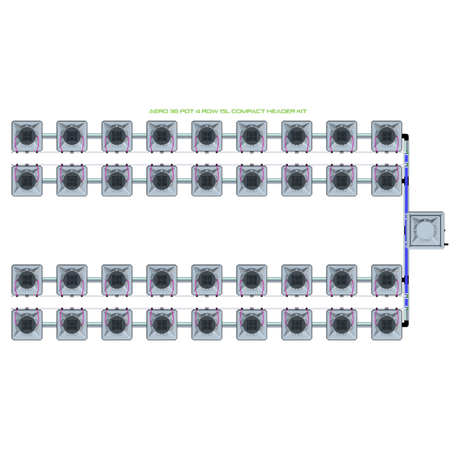 The ALIEN AERO 36 Pot 4 Row Kit is a top-tier aeroponic system designed to support the growth of up to 36 plants with precision and efficiency. Offering two pot sizes and two header configurations, this kit provides flexible options to accommodate various growing needs. Its simple configuration and assembly process ensure an easy setup, while advanced features maximize plant growth potential. One standout feature of this system is the ability to create an aisle in the middle of the rows, allowing for complete access to your plants for convenient maintenance and care. Utilizing cutting-edge aeroponic technology, it optimally delivers water, oxygen, and nutrients directly to the roots, promoting rapid and healthy growth. Ideal for growers looking for a high-capacity and space-efficient system, the ALIEN AERO 36 Pot 4 Row Kit makes growing 36 plants to perfection easy and effective.