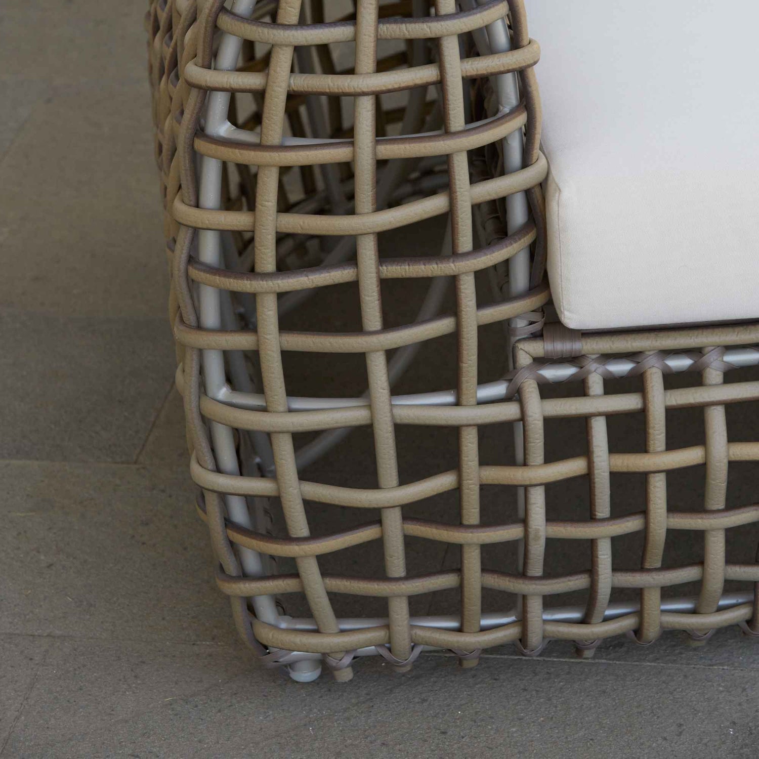 Elevate your outdoor lounging experience with the Dynasty Armchair—a striking blend of modern design and enduring quality. Featuring an open-weave silhouette handcrafted from durable synthetic fiber over a powder-coated aluminum frame, this armchair is built to withstand the elements in both residential and hospitality environments. Plush Sunbrella cushions deliver unmatched comfort and weather resistance, while the bold, sculptural profile adds a sophisticated edge to any outdoor space. Choose from three elegant finishes to complement your aesthetic.