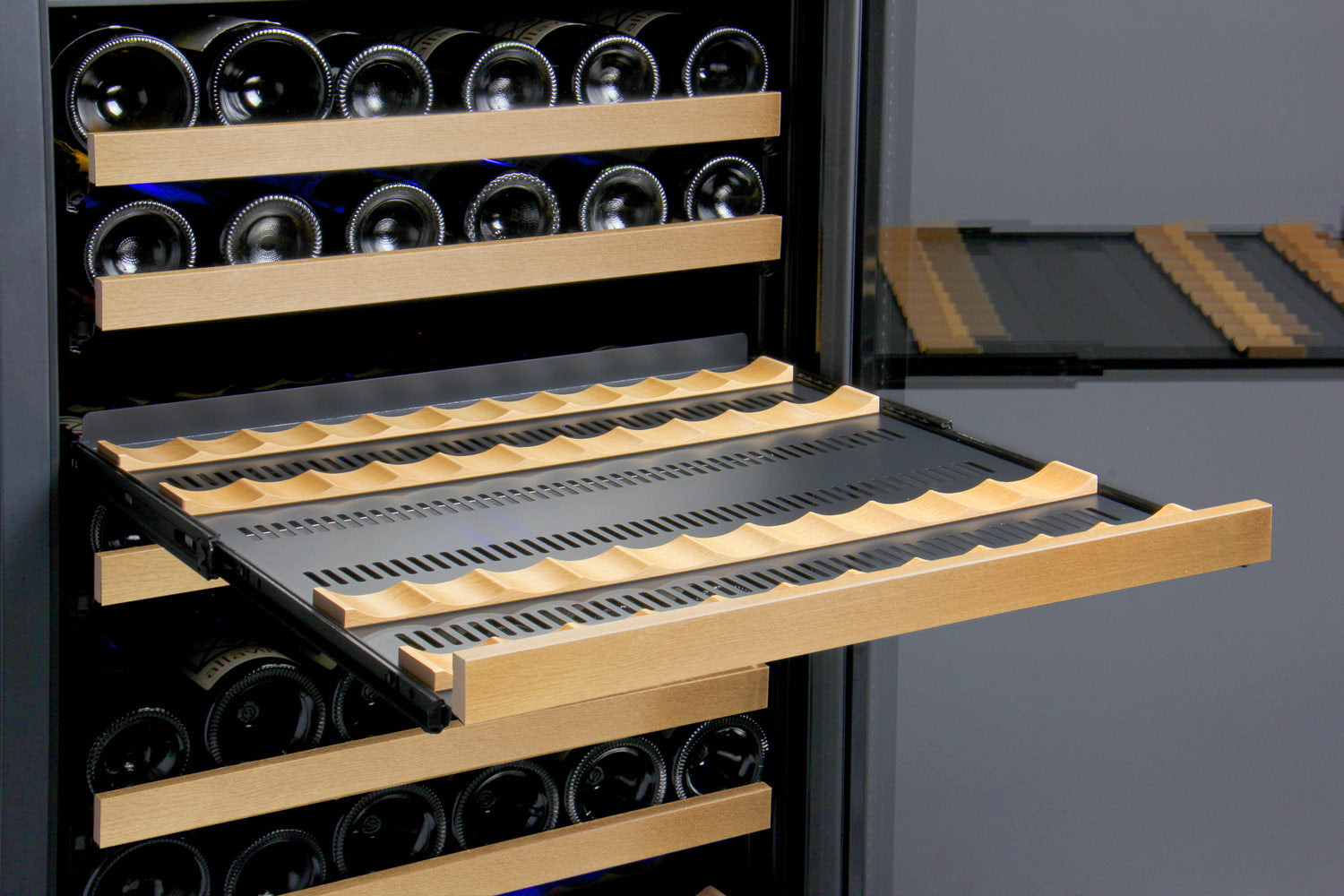 Inside, Allavino’s exclusive FlexCount shelving system provides versatile, vibration‑reducing racks that cradle bottles securely and glide out smoothly for convenient access. With space for up to 344 bottles across 28 shelves, this wine refrigerator accommodates a wide range of bottle sizes and styles, making it a standout solution for large collections, cellars, or entertainment spaces where both performance and presentation matter.