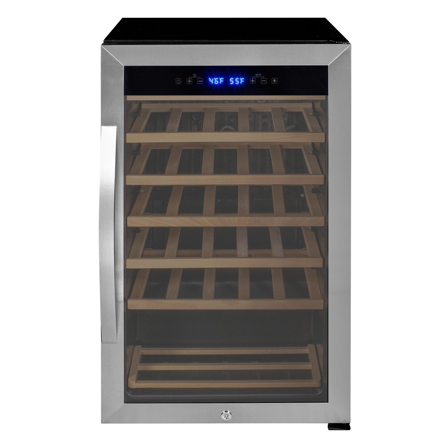 Inside, sturdy hardwood front shelves and a bottom storage area provide versatile bottle organization and easy access. Integrated blue LED lighting illuminates the interior with minimal heat for elegantly displaying your collection. A keyed locking door adds peace of mind by securing your wines.