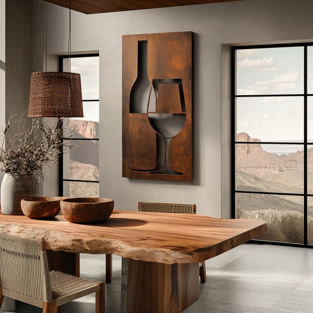 A bottle and glass stand in balanced form, their shapes pared to clean edges against the steel. The Sommelier carries the spirit of gathering and taste, a silhouette that speaks to refinement, warmth, and ritual.