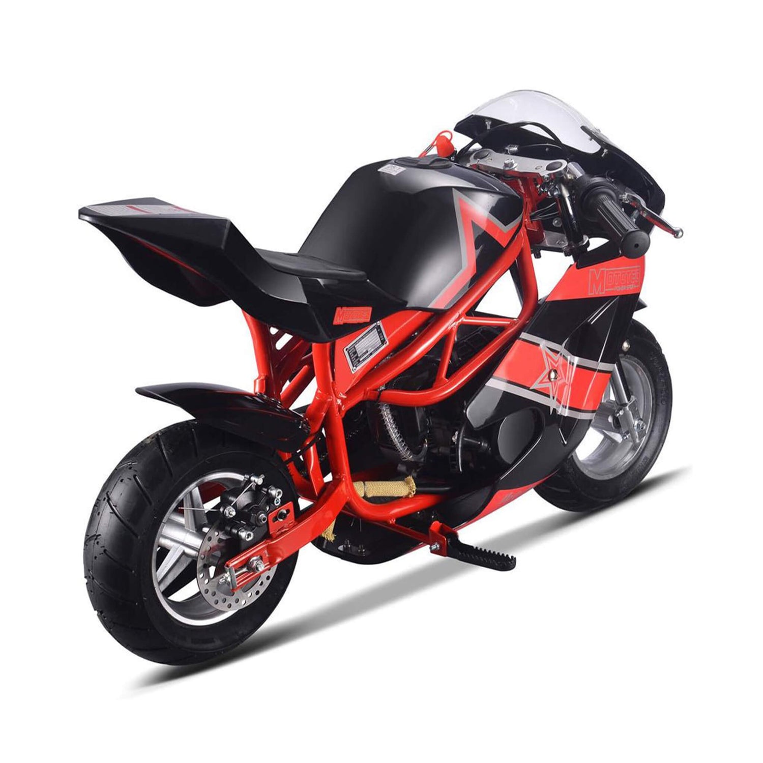 • This pocket bike uses a fuel mixture of unleaded gasoline and 2-stroke oil at a 32:1 ratio and features a centrifugal chain drive transmission for smooth operation.