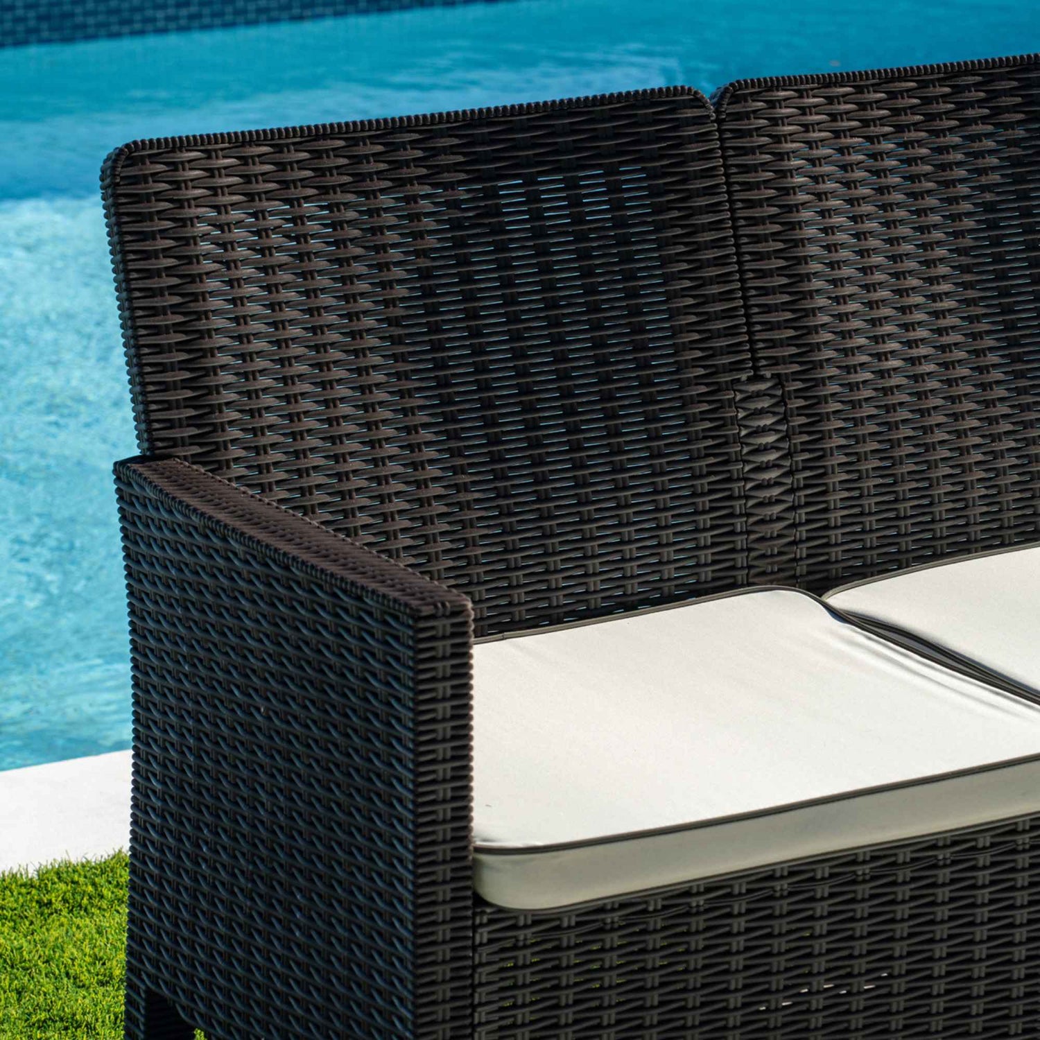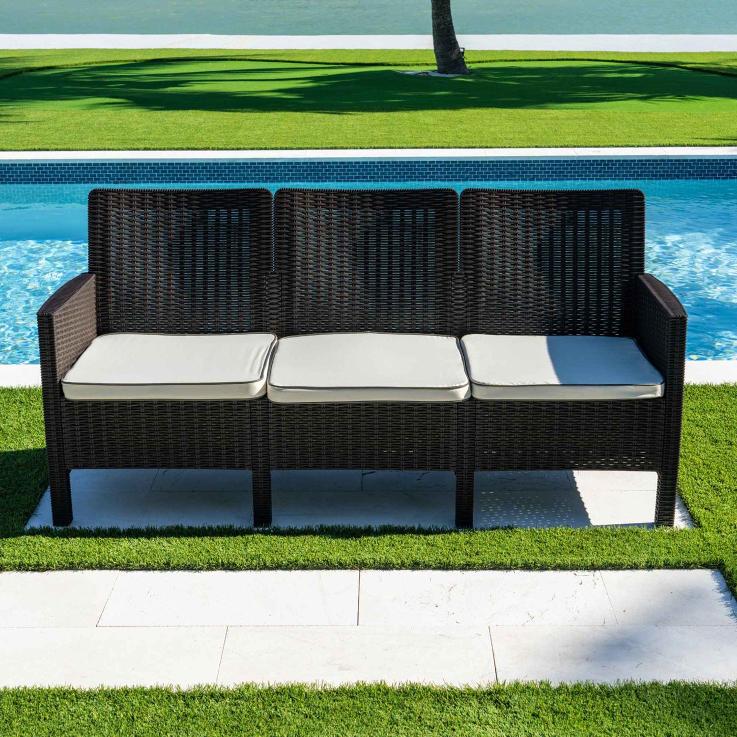 Enhance your outdoor lounging area with the Nova Sofa, designed with classic lines and a warm brown finish that complements any setting. Built from durable, weather-resistant polypropylene plastic, this sofa withstands the elements while delivering long-lasting comfort and style. Plush, easy-care seat cushions add inviting softness, making it the perfect centerpiece for patios, balconies, or garden spaces.