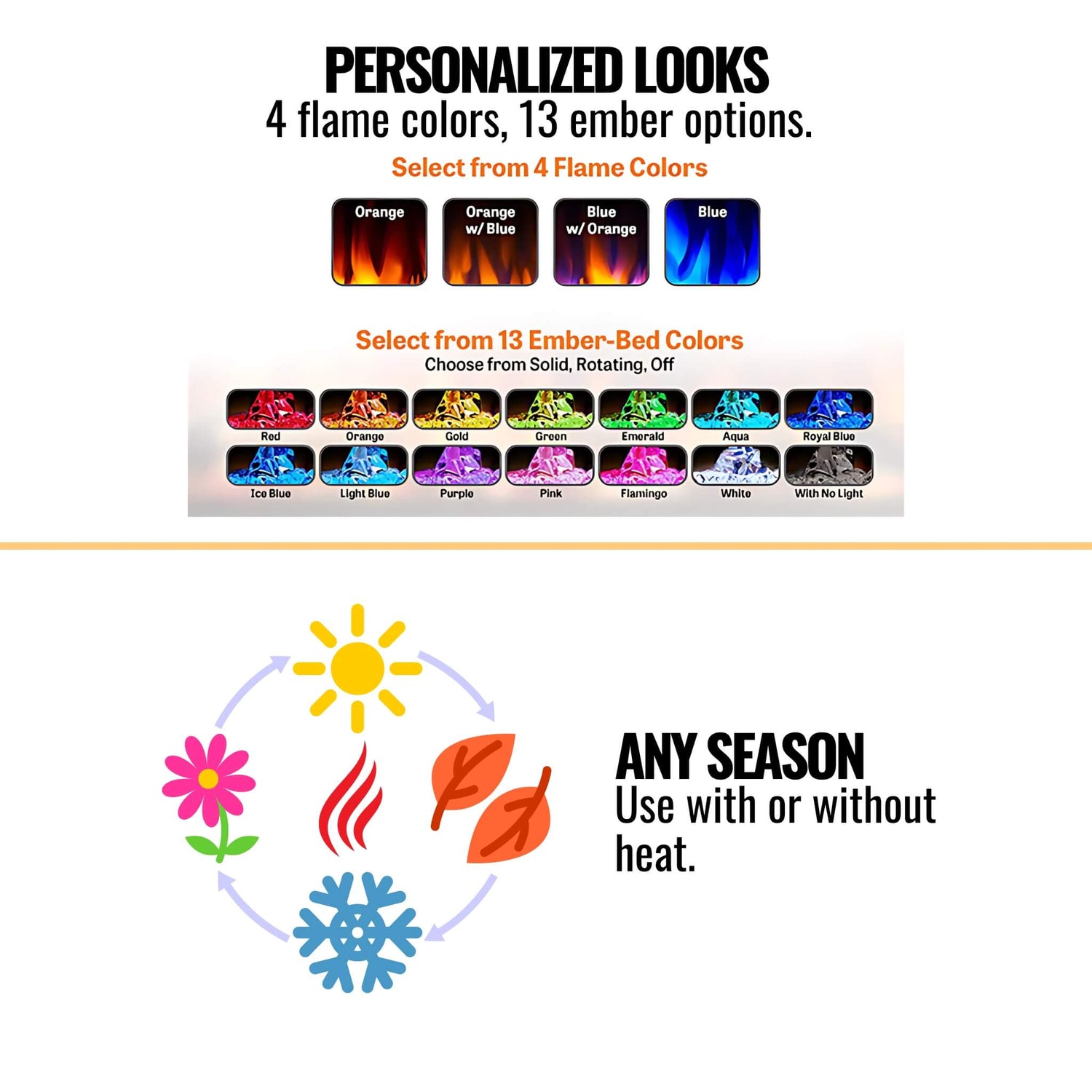 - Flames can operate with or without heat, making it perfect for year-round enjoyment.