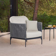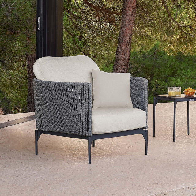 Crafted with a powder-coated aluminum frame and durable light gray polystrand strap rope, the Boston Armchair is built to withstand the elements while maintaining its sophisticated charm. The included cushion, upholstered in premium 5453 Sunbrella Canvas or your choice of other Sunbrella fabric options, allows you to tailor the look to suit your style and outdoor environment, ensuring lasting vibrancy and comfort.