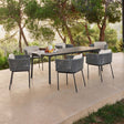 Anchored by a streamlined rectangular dining table with a tempered glass top, this collection balances aesthetics and durability in any upscale patio, terrace, or garden.