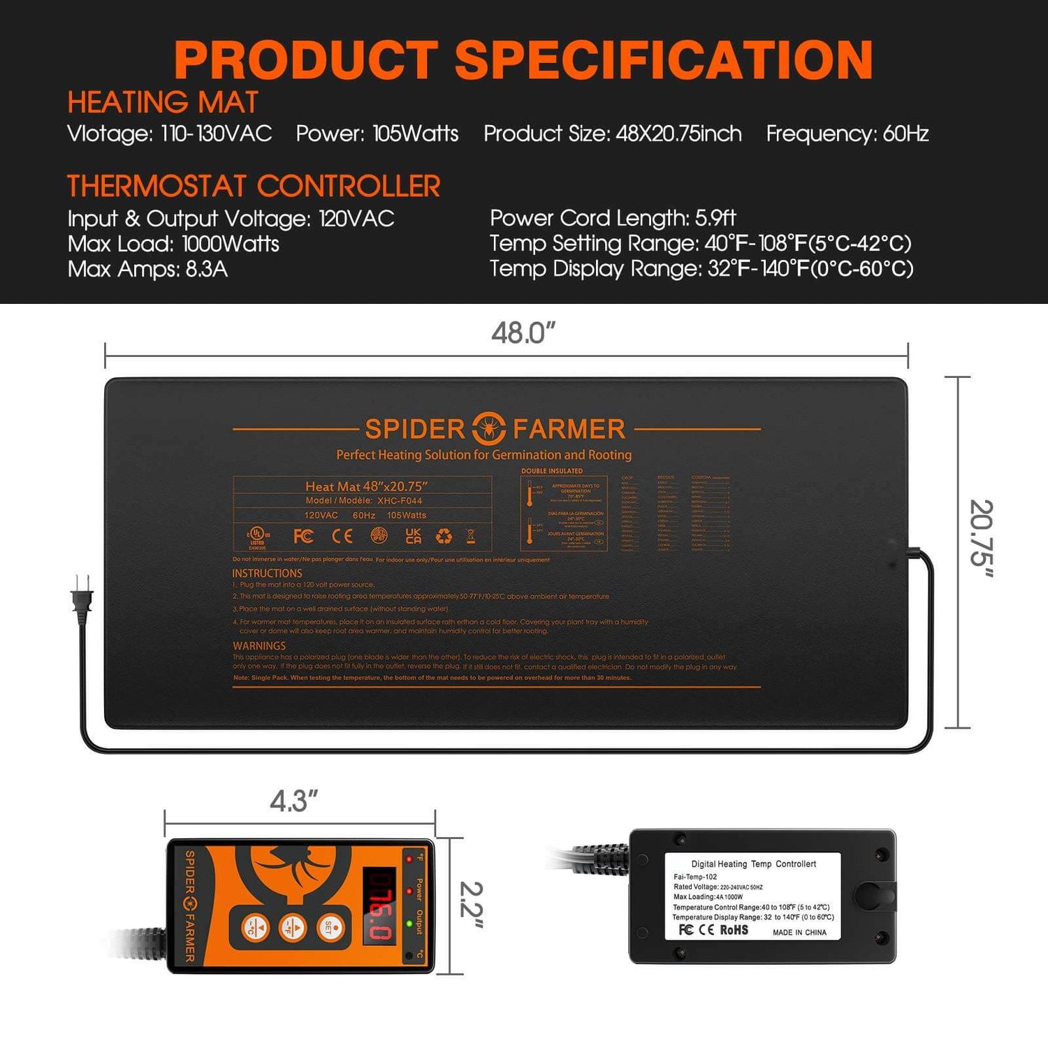 The Spider Farmer® 48”X20.75” Seedling Heat Mat & Controller Set is designed to improve the germination process and the success rate of seedlings and cuttings by warming the root area. Here are some key features and benefits of the heat mat and controller set:
