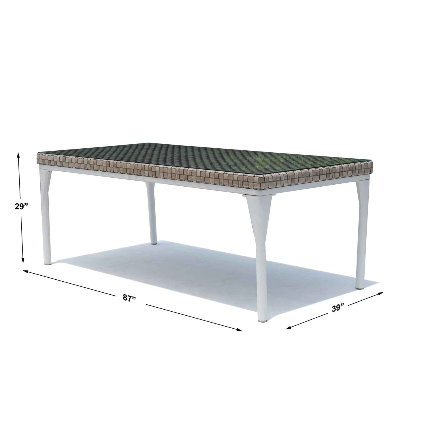 The Brafta Rectangular Dining Table offers a refined centerpiece for outdoor entertaining. Crafted with a white powder-coated aluminum frame and handwoven 30mm Ecolene Seashell fiber, it showcases a seamless blend of coastal charm and modern design. The expansive tempered glass tabletop provides a sleek, durable surface ideal for hosting up to six guests for everything from casual brunches to evening gatherings. Built with weather-resistant materials, this table is as functional as it is stylish.