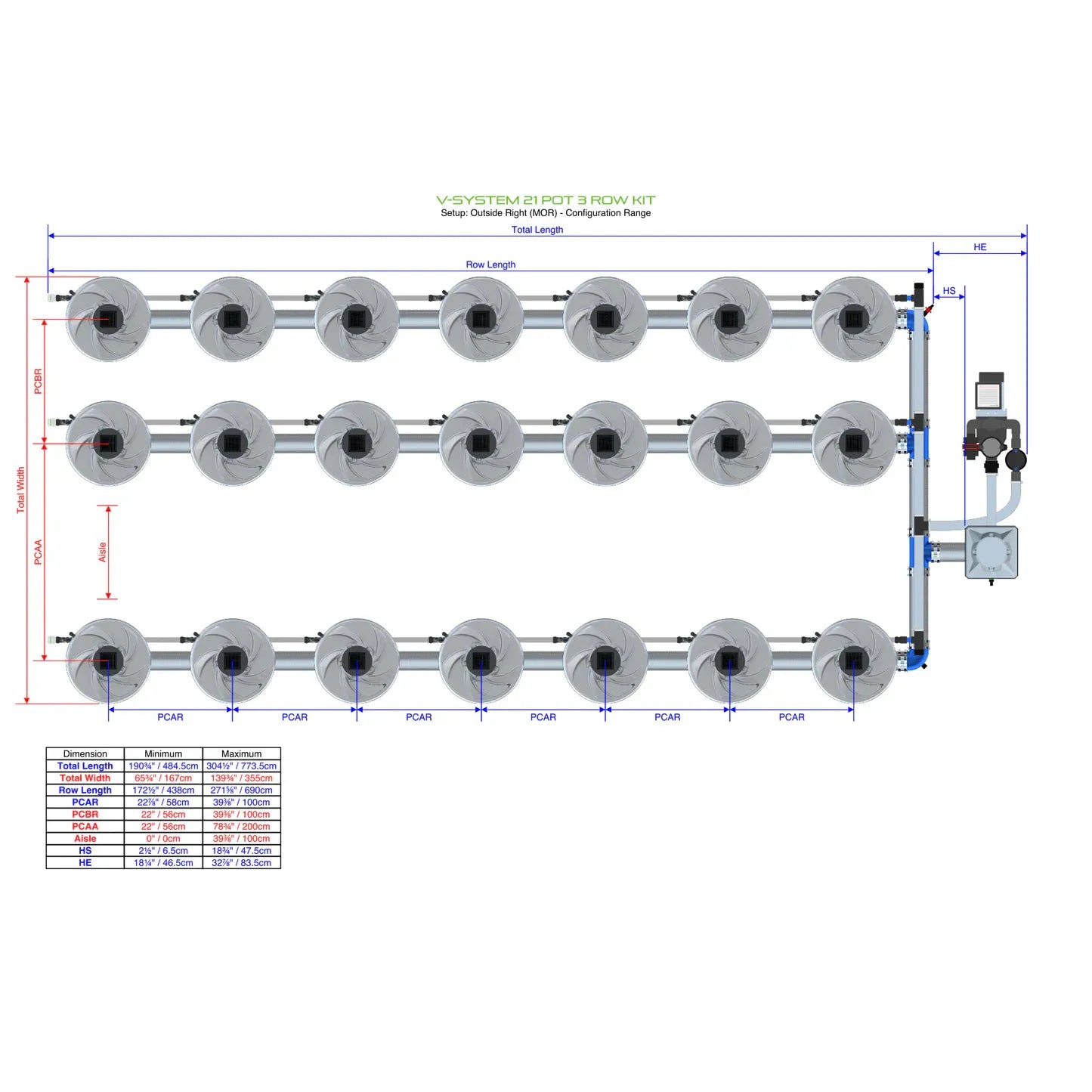 The ALIEN V-SYSTEM 21 Pot 3 Row Kit provides 4 flexible layout options for header and pump placement, ensuring the best fit for your grow space. Position the components outside a grow tent/room or keep them compact based on your setup needs. Designed for easy assembly with advanced features, this system also allows for a center aisle, giving you full access to your plants. Grow 21 plants effortlessly in the ultimate recirculating deep water culture system!