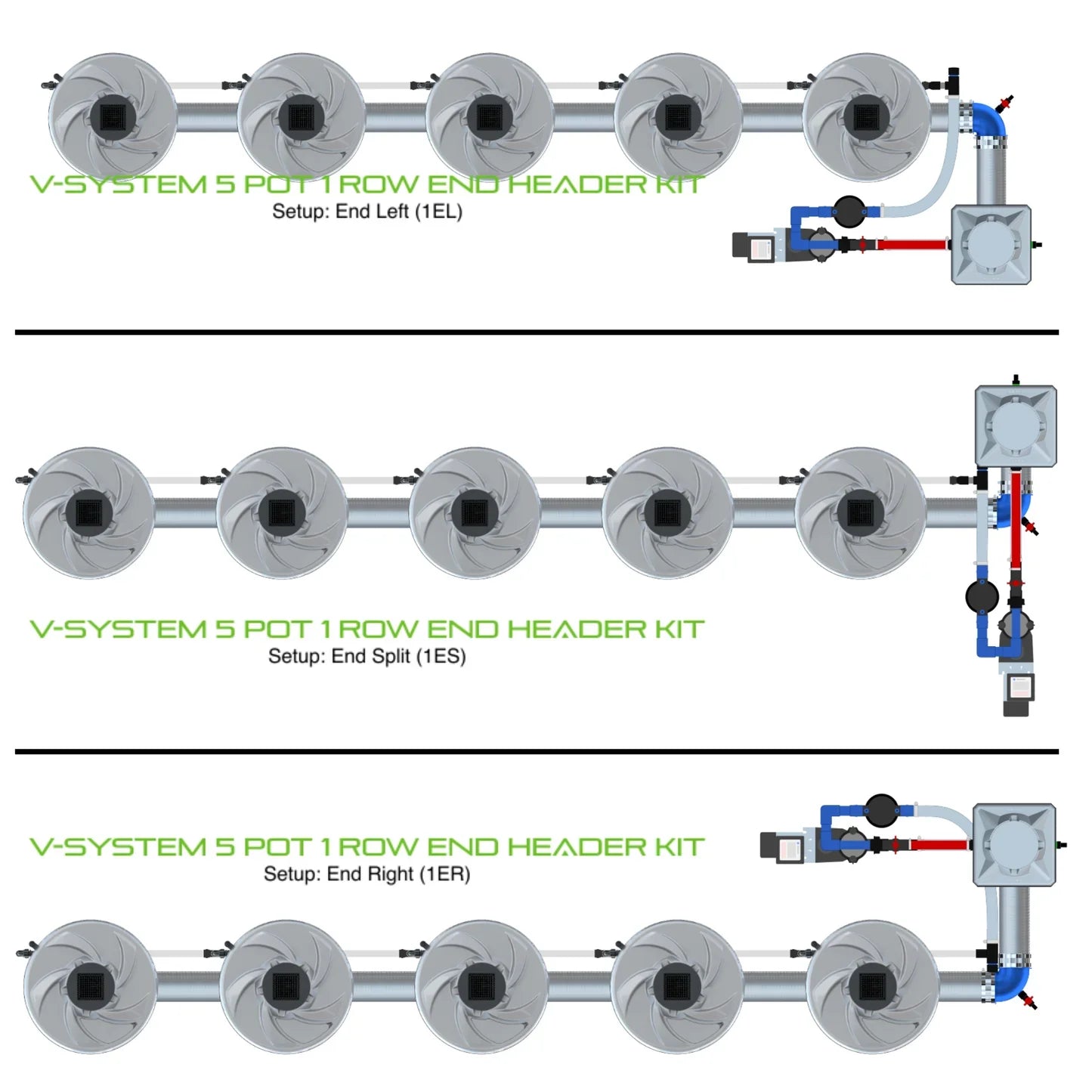 The ALIEN V-SYSTEM 5 Pot 1 Row Kit is available in two configurations: one with the header at the end of the row and one with the header in the middle. The end header kits offer 3 layout options for header and pump placement, while the middle header kits provide 2 layout options. Designed for flexibility, the header and pump can be positioned outside a grow tent/room or configured compactly to fit your space. With easy assembly and advanced features, this system ensures optimal plant growth. Grow 5 plants to perfection in recirculating deep water culture with the ALIEN V-SYSTEM Kit!