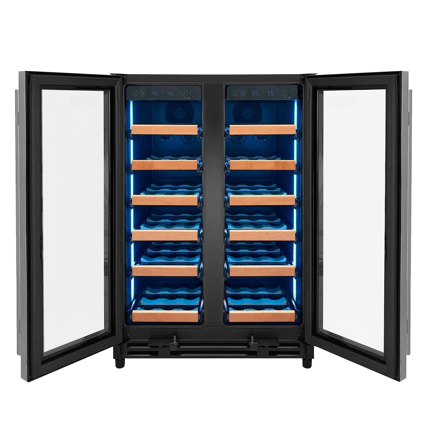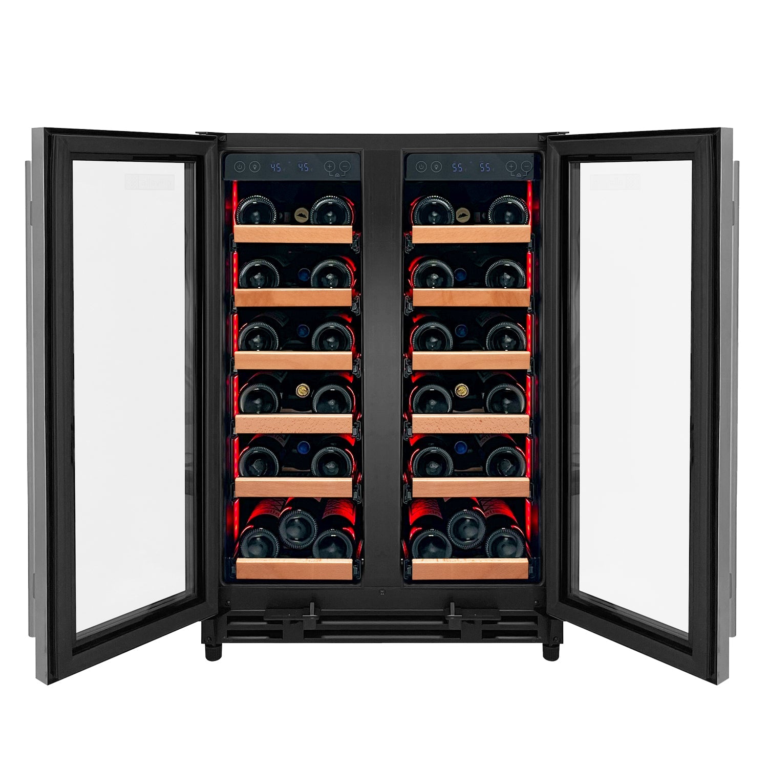 Dual cooling zones with independent digital temperature controls for storing red and white wines at ideal temperatures
