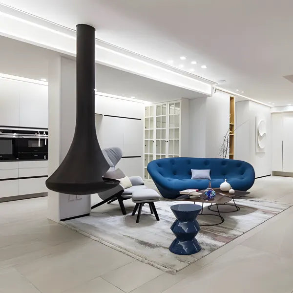This suspended horn-shaped fireplace blends modern aesthetics with a distinctive design, making it a true centerpiece for any space. Its unique horn form creates a striking visual impact while enhancing airflow efficiency. The hanging structure frees up floor space and introduces a sense of lightness and elegance, making it an ideal addition to both contemporary homes and stylish commercial settings.