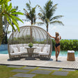 The Nexus Daybed reimagines outdoor lounging with its sculptural dome-shaped design, blending shelter, style, and social function into one luxurious centerpiece. Handwoven in a weather-resistant Black Mushroom finish over a powder-coated aluminum frame, it offers year-round durability. The built-in canopy provides shade and a sense of enclosure, while plush Sunbrella cushions deliver cloud-like comfort. At the heart of the daybed, a matching woven dining table with a tempered glass top invites you to relax, dine, or entertain.