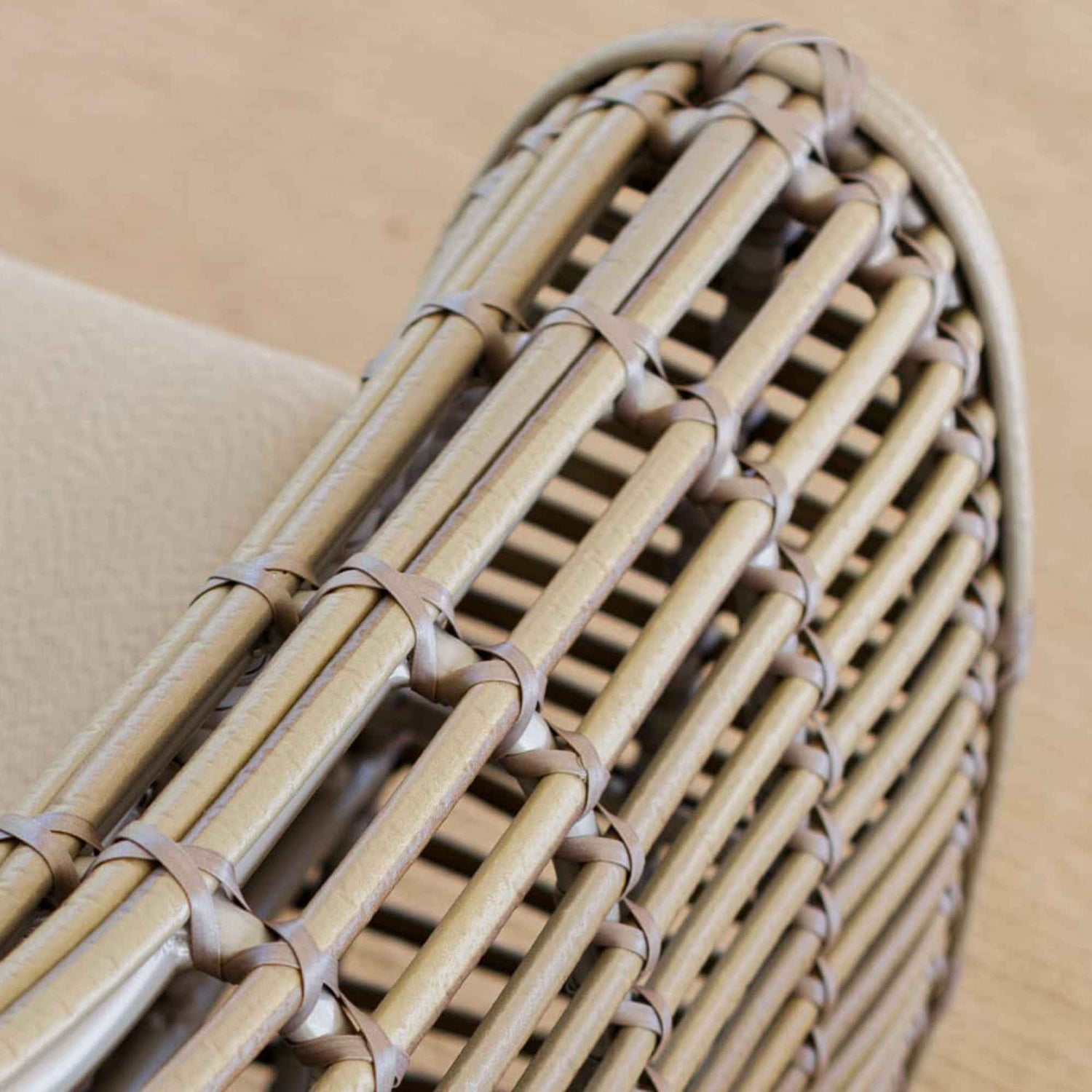 The Ruby Armchair is a bold statement of sophistication and comfort for any outdoor setting. Built on a powder-coated aluminum frame finished in Silver Walnut, it features handwoven Ecolene Kubu Mushroom fibers in a distinctive open-weave pattern. The included Sunbrella cushion delivers plush support with exceptional resistance to sun, rain, and mildew. Perfect for upscale patios, garden lounges, or poolside retreats, this armchair seamlessly balances style with functionality.
