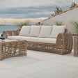 The Ruby Sofa delivers a stunning fusion of modern design and outdoor durability. Crafted with a powder-coated aluminum frame in a Silver Walnut finish, its elegant open-weave silhouette is formed from handwoven HDPE Viro Fiber in a natural Kubu Mushroom tone. The plush Sunbrella cushions offer superior weather resistance and lasting comfort, making this piece ideal for patios, lounges, and refined outdoor retreats.