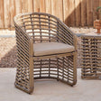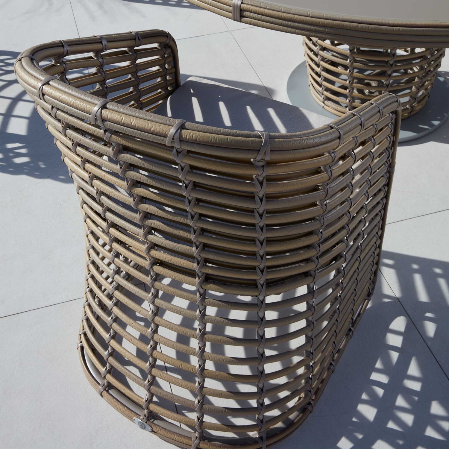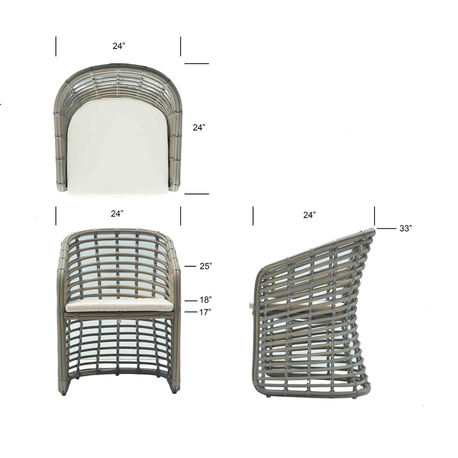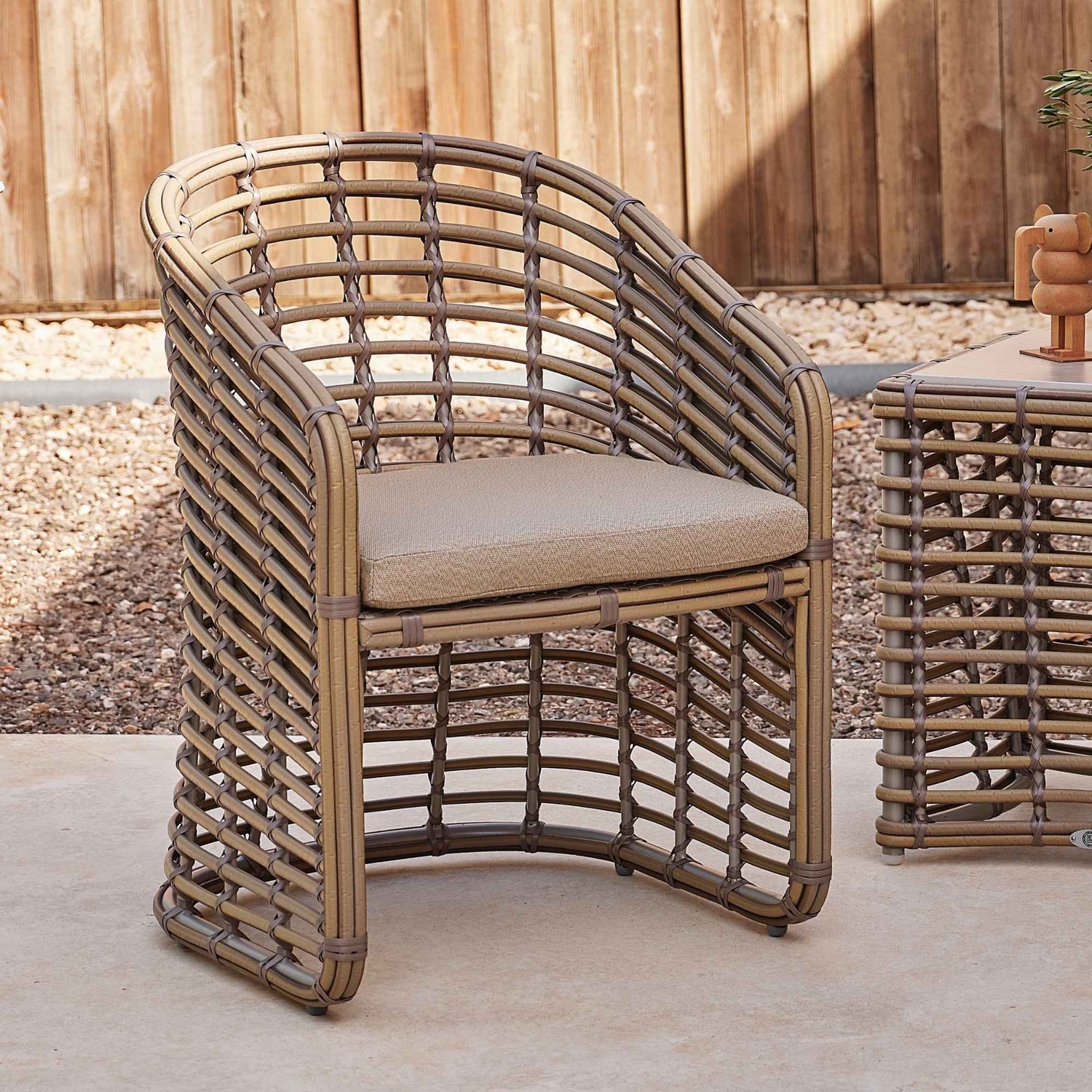 Elevate your outdoor dining experience with the Ruby Dining Armchair. Featuring a powder-coated aluminum frame in an elegant Silver Walnut finish, it’s wrapped in handwoven HDPE Viro Fiber for a naturally textured, open-weave look. The Sunbrella cushion adds comfort and weather resistance, making this chair ideal for patio dinners, terrace brunches, or upscale outdoor gatherings.