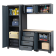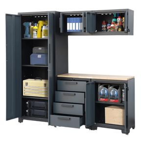 - Garage cabinets 6 piece set includes 1x cabinet with a drawer, 1x cabinet with 4 drawers, 1x tall cabinet, 1x wood work top, and 2x smaller top wall cabinets that feature a fully welded steel structure for added support.