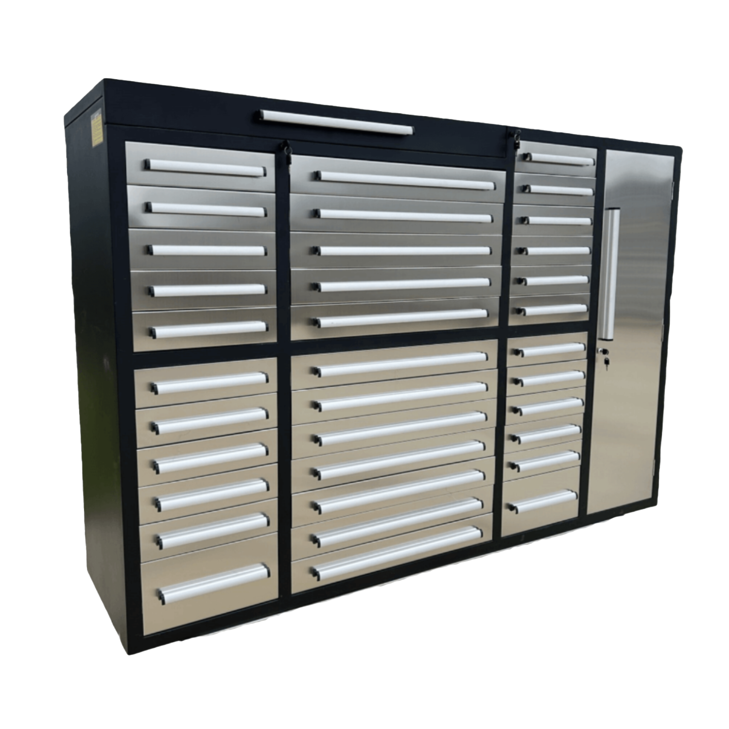 The unit also features a secure locking system to protect valuable tools and equipment when not in use. Its thoughtfully designed layout maximizes available storage while maintaining a professional appearance in any workspace.
