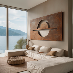 A bold horizon cuts through a rising circle in The Meridian, evoking the meeting of day and night. Its balanced form suggests navigation, time, and the quiet certainty of true north.